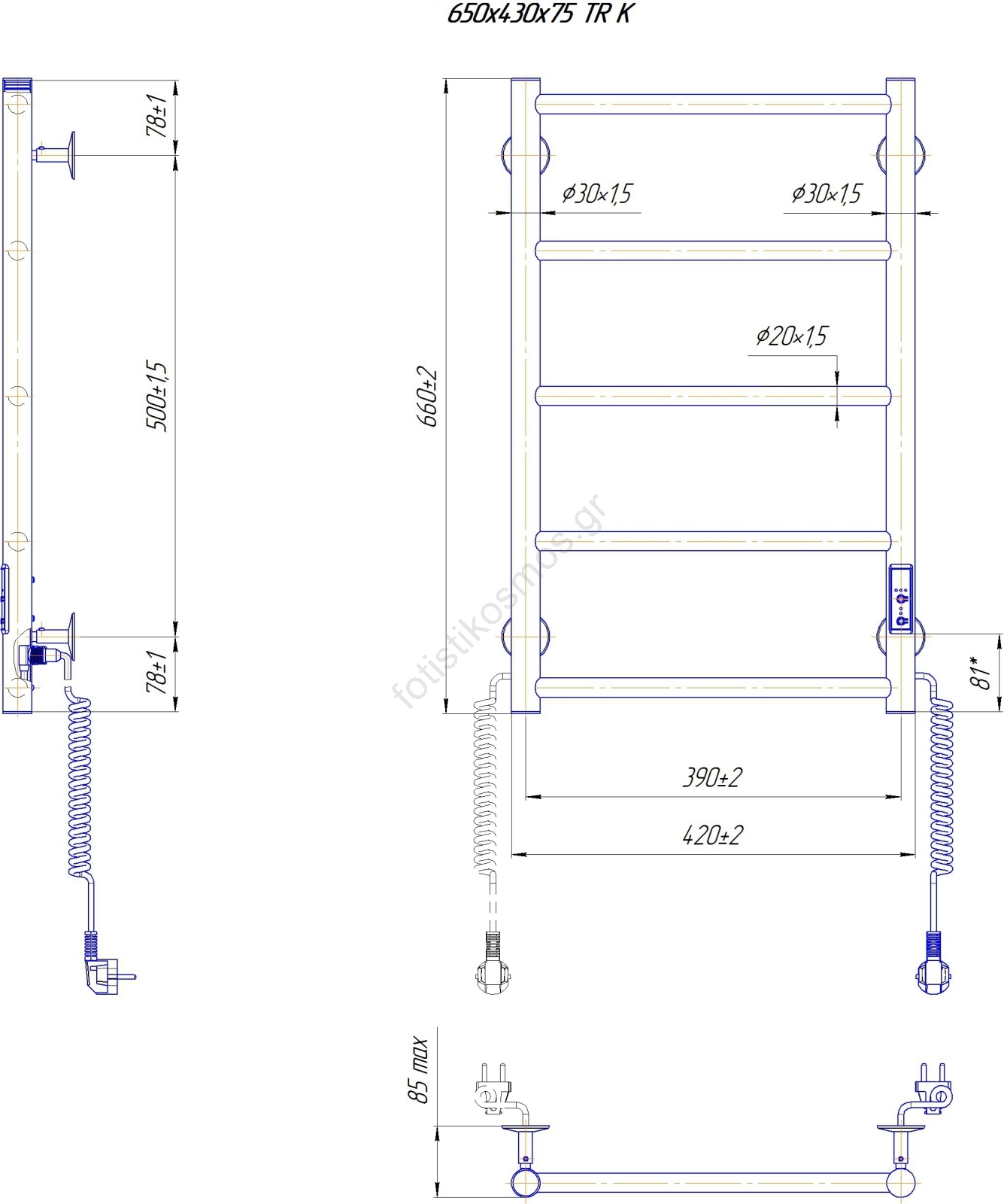 Πετσετοκρεμάστρα μπάνιου CLASSIC 65W/230V 66x42 cm, από ανοξείδωτο ατσάλι με γυαλιστερό χρώμιο, δεξιά