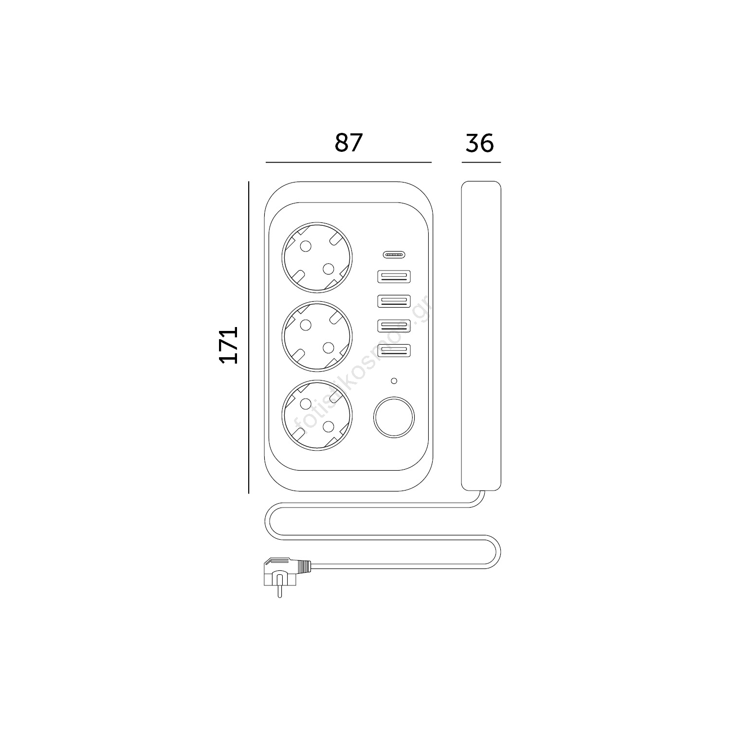 • Αριθμός πριζών: 3 x 230V, 4 x USB-A και 1 x USB-C.