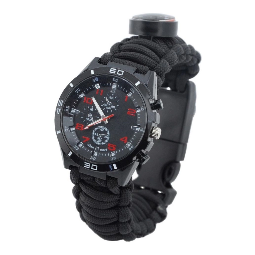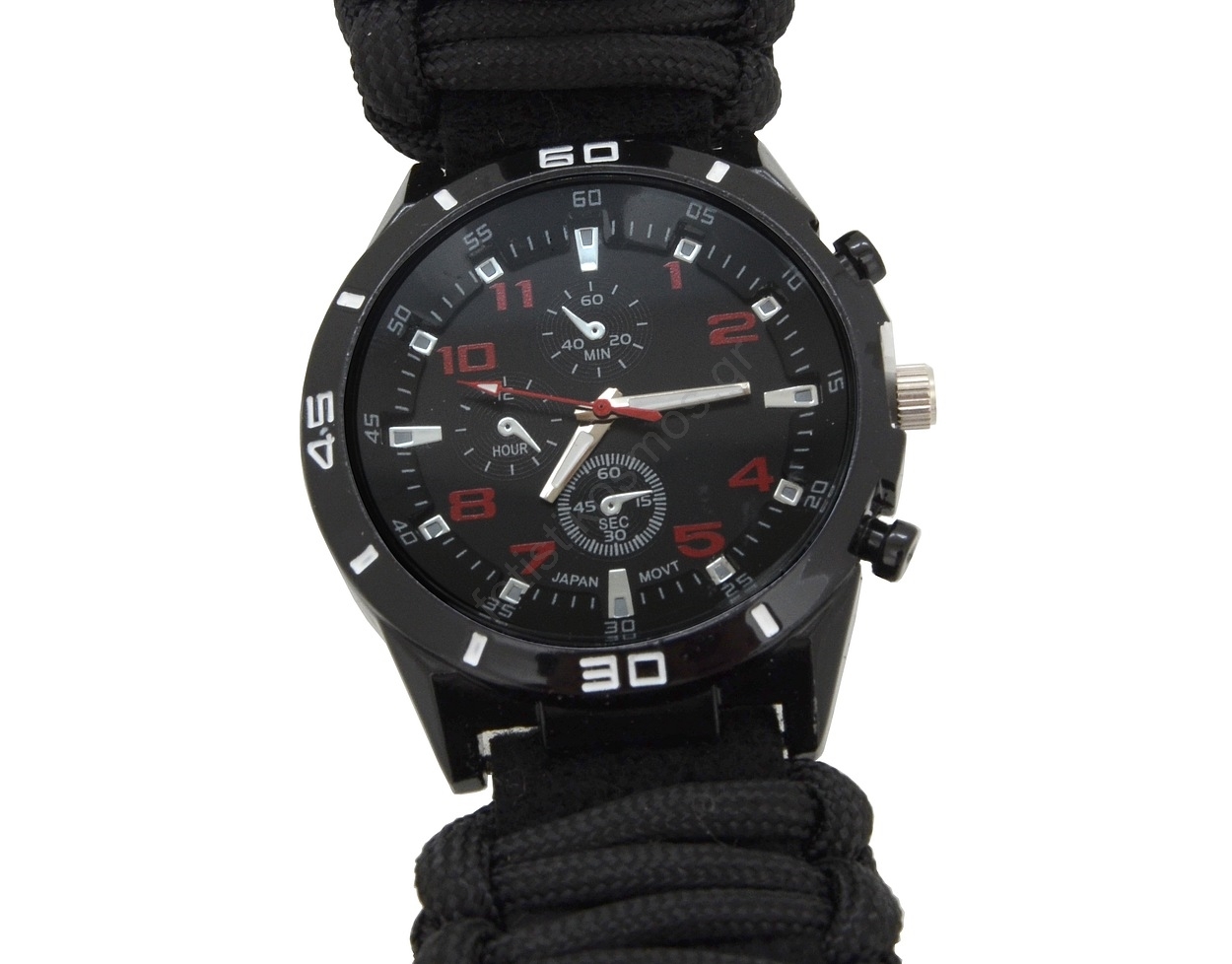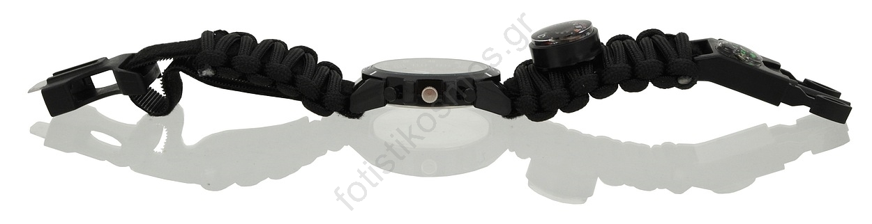 • Το ρολόι διαθέτει πυξίδα, θερμόμετρο, σφυρίχτρα και λουράκι πλεγμένο μεκορδόνι paracord, το οποίο μπορεί να ξετυλιχτεί εντελώς και να χρησιμοποιηθεί ως σχοινί σε περίπτωση ανάγκης.