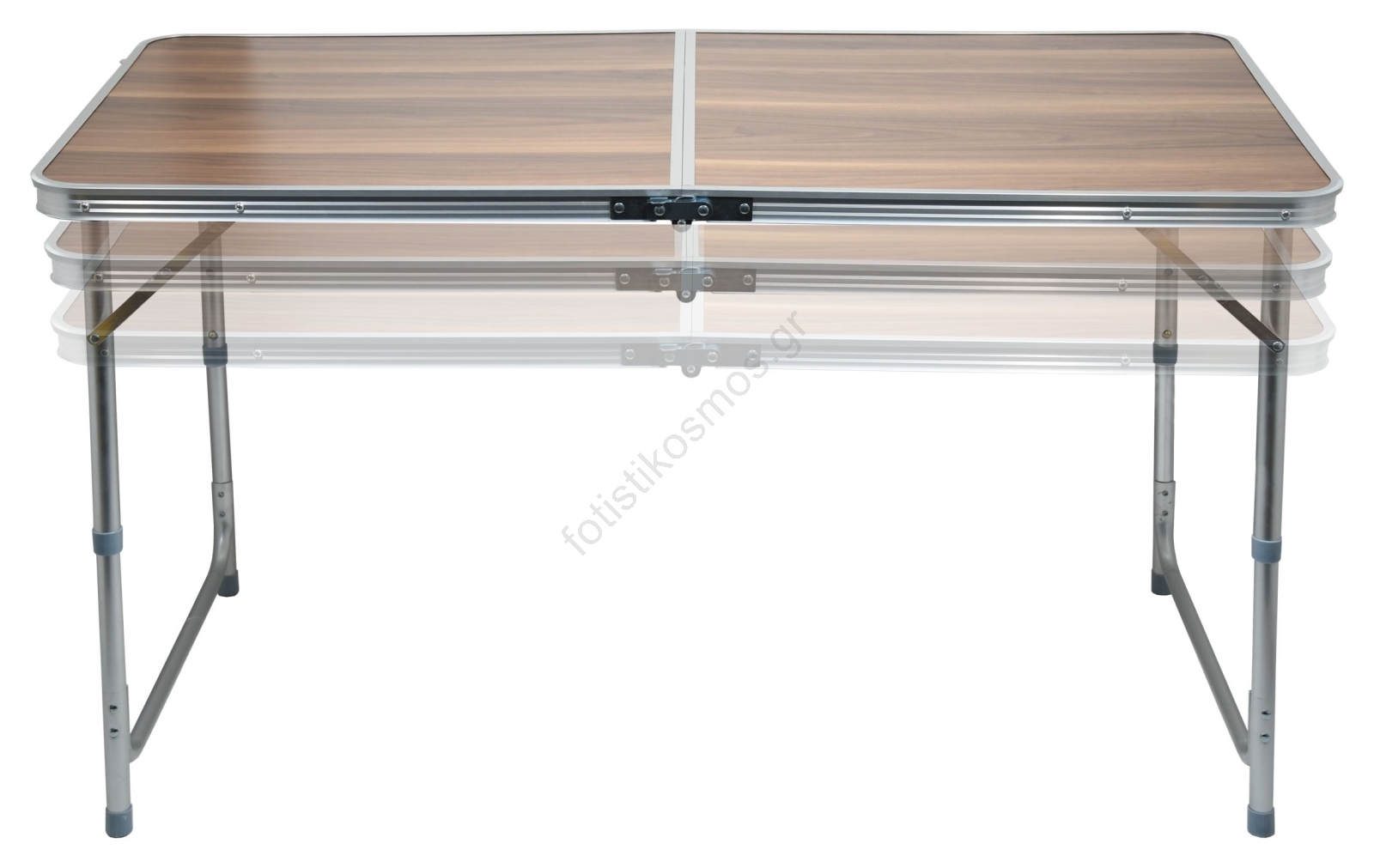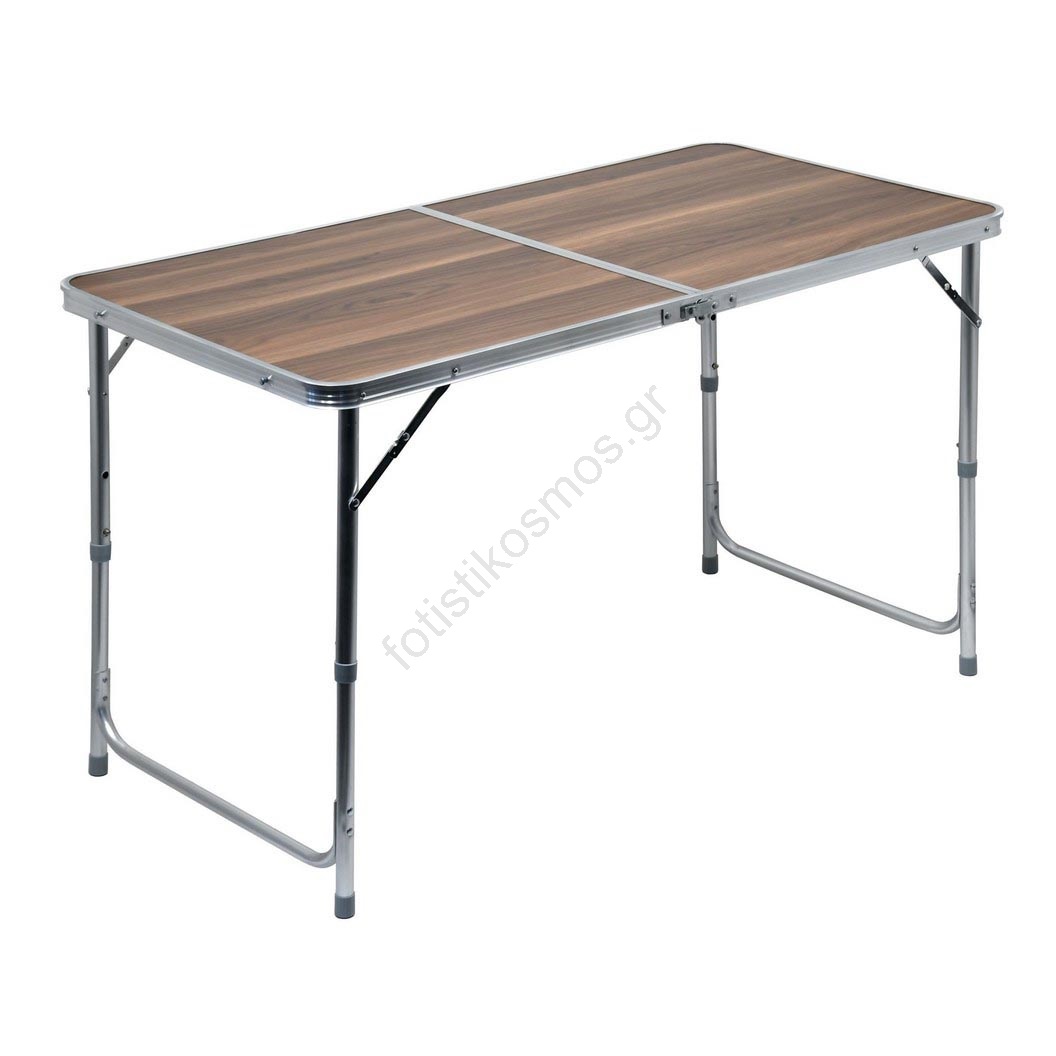 • Πτυσσόμενο τηλεσκοπικό τραπέζι από αλουμίνιο με επίπεδη επιφάνεια και σχέδιο απομίμησης ξύλου άριστης ποιότητας.