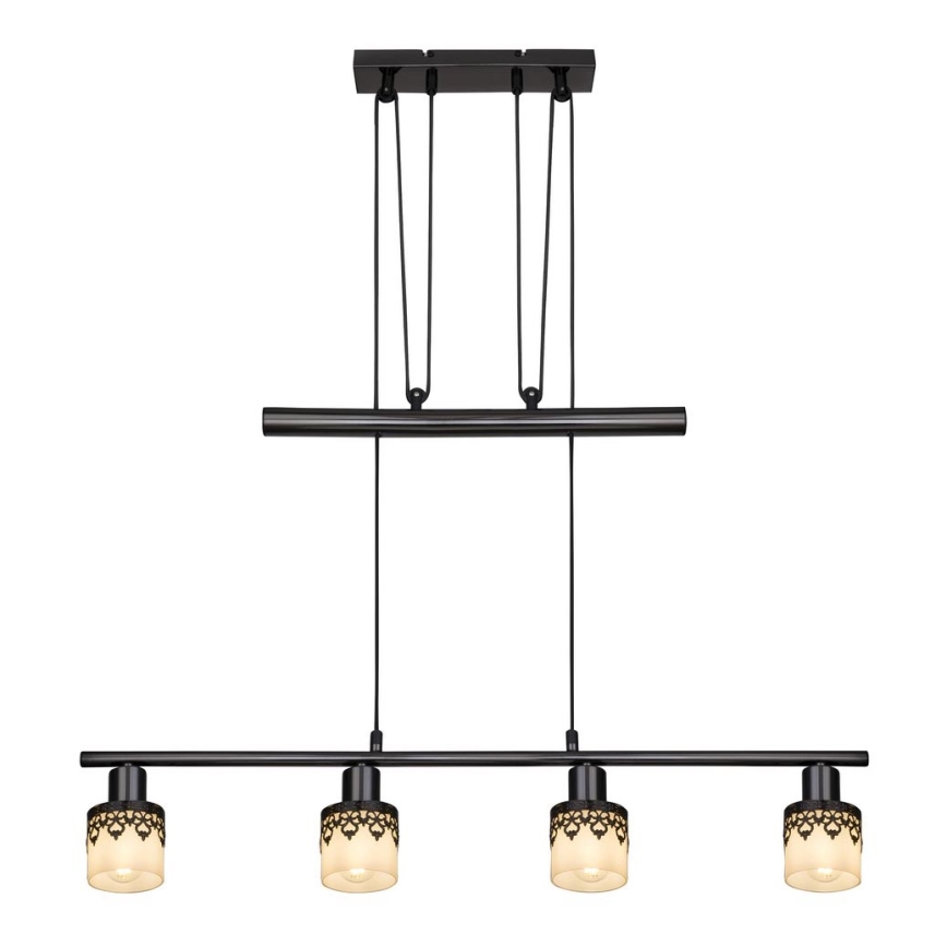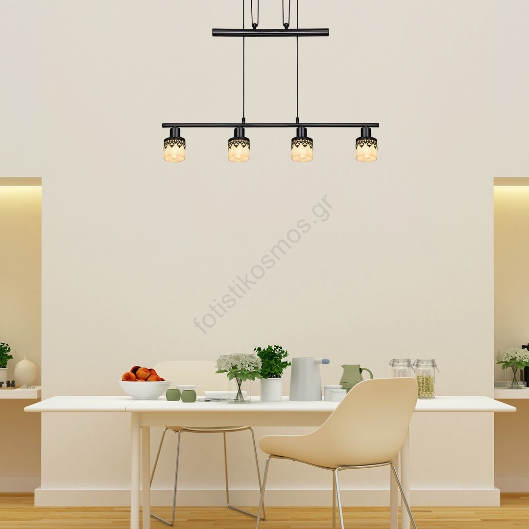 Χάρη στο ρομαντικό του στυλ, το κρεμαστό φωτιστικό Lacey με τέσσερα φώτα αποτελεί μια εντυπωσιακή προσθήκη στη διακόσμηση του σπιτιού σας. Είτε τοποθετηθεί στο σαλόνι είτε στην τραπεζαρία, αυτό το μοντέλο από συνδυασμό μετάλλου και γυαλιού με ρυθμιζόμενο ύψος θα τραβήξει σίγουρα την προσοχή των καλεσμένων σας. Το μεταλλικό φωτιστικό Lacey συμπληρώνεται από τέσσερις λευκές κυλινδρικές γυάλινες αποχρώσεις με μαύρη δαντελένια διακόσμηση γύρω τους. Η επιμήκης ορθογώνια διακοσμητική βάση είναι μαύρη, ενώ το φωτιστικό διαθέτει κομψό χρωμιωμένο φινίρισμα. Το κρεμαστό φωτιστικό μπορεί να χρησιμοποιηθεί με τέσσερις λαμπτήρες ισχύος έως 40 W ο καθένας, με ντουί τύπου E14. Ανάλογα με το επιθυμητό αποτέλεσμα στον χώρο, μπορείτε να επιλέξετε λαμπτήρες με φυσικό ή ζεστό λευκό φως. Το φωτιστικό Lacey έχει συνολικό πλάτος 790 mm και ρυθμιζόμενο ύψος από 870 έως 1600 mm. Το κρεμαστό φωτιστικό με τέσσερα φώτα παραδίδεται χωρίς λαμπτήρες.