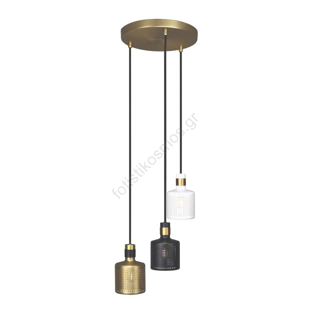 Το τριπλό κρεμαστό φωτιστικό Alberta σε βιομηχανικό στυλ αποτελεί μια εντυπωσιακή προσθήκη για το σύγχρονο σαλόνι, υπνοδωμάτιο ή γραφείο σας. Αυτό το μοντέλο στερεώνεται σε μια χρυσή στρογγυλή διακοσμητική βάση και είναι κατασκευασμένο εξ ολοκλήρου από μέταλλο σε συνδυασμό χρωμάτων χρυσού, μαύρου και λευκού, με υφασμάτινα καλώδια. Η μοναδικότητα του φωτιστικού Alberta οφείλεται στα τρία φωτιστικά κεφαλές του, που είναι κατασκευασμένες σε διαφορετικά χρώματα και κρέμονται σε διαφορετικά ύψη. Μέσω των διάτρητων καπέλων τους, το φως διαχέεται χαρακτηριστικά στον χώρο. Το κρεμαστό φωτιστικό μπορεί να χρησιμοποιηθεί με τρεις λάμπες, καθεμία με ισχύ έως 9W, με ντουί E27. Αν επιθυμείτε να δημιουργήσετε μια ζεστή και οικεία ατμόσφαιρα στο δωμάτιο, επιλέξτε θερμές λευκές πηγές φωτός. Οι διαστάσεις του τριπλού κρεμαστού φωτιστικού Alberta είναι οι εξής: απόσταση από την οροφή 1.500 mm, διάμετρος εγκατάστασης 250 mm. Αυτό το μοντέλο παραδίδεται χωρίς πηγές φωτός.
