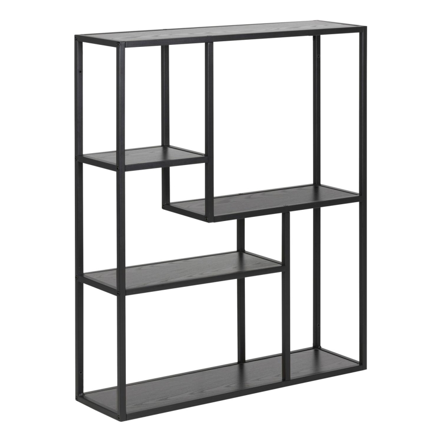• Πλαίσιο από μαύρο ματ ηλεκτροστατικά βαμμένο χάλυβα, 3 ράφια από μελαμίνη σε μαύρη απόχρωση όψης ξύλου φράξου με ασύμμετρες λεπτομέρειες.