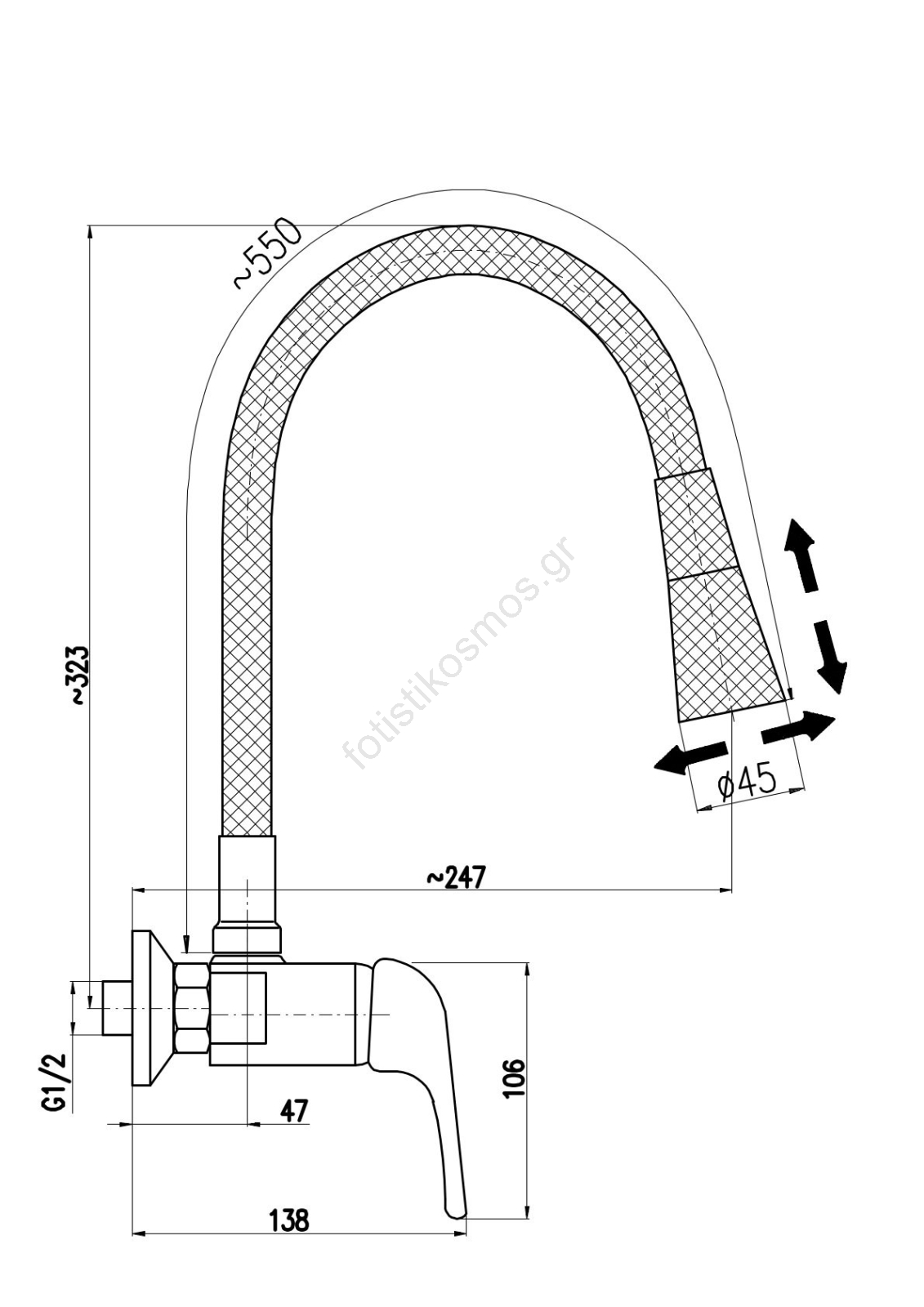 • Επιτοίχια μπαταρία νεροχύτη με ευέλικτο περιστρεφόμενο στόμιο και κεφαλή ψεκασμού (ντους).