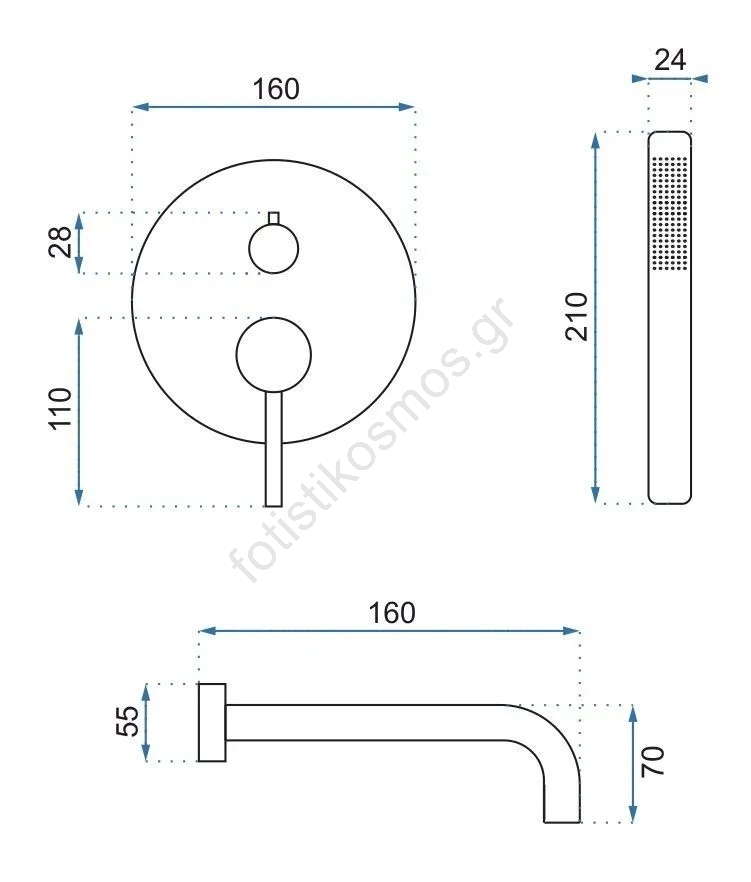 • Σετ περιλαμβάνει: μπαταρία μπανιέρας, επιτοίχια εκροή, χειρολαβή ντους, σωλήνας ντους (160 mm), βάση χειρολαβής ντους.