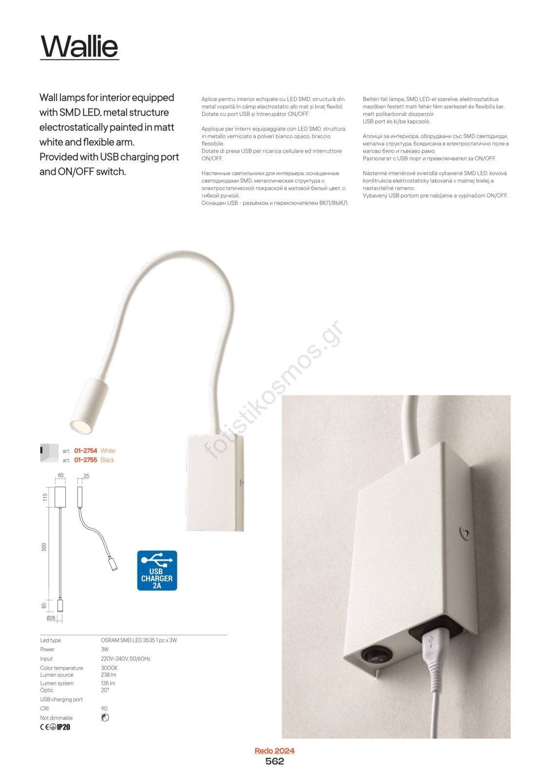• Redo 01-2754 - Ευέλικτο LED φωτιστικό WALLIE LED/3W/230V USB CRI 90 λευκό