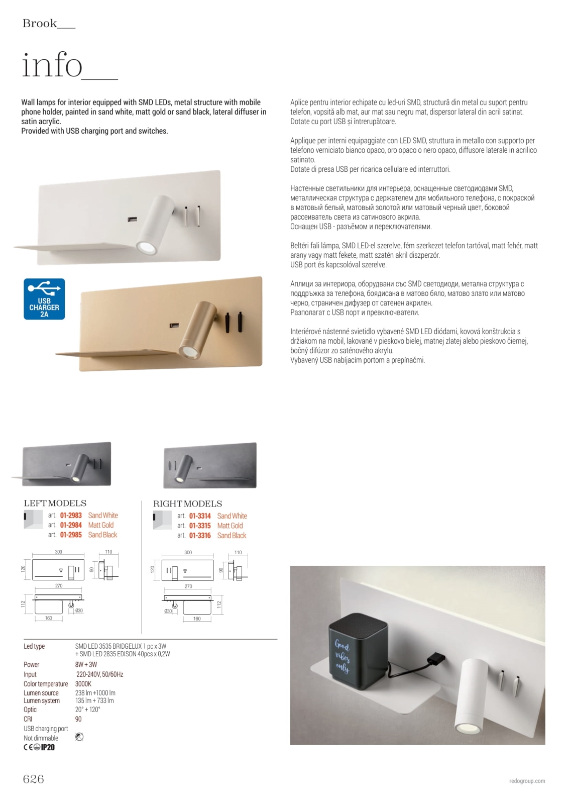 Redo 01-3316 - Φωτιστικό σποτ τοίχου LED BROOK LED/8W/230V + LED/3W USB CRI 90 μαύρο right