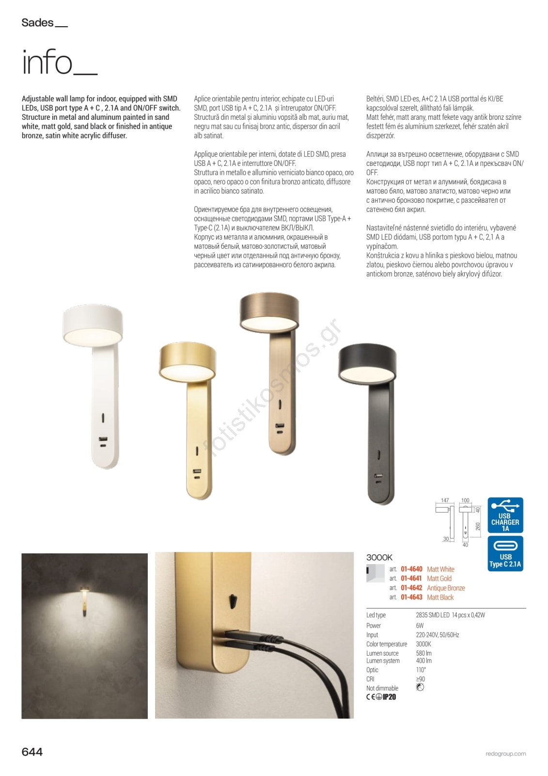 • Redo 01-4640 - Επιτοίχιο φωτιστικό SADES LED/6W/230V CRI 90 USB λευκό