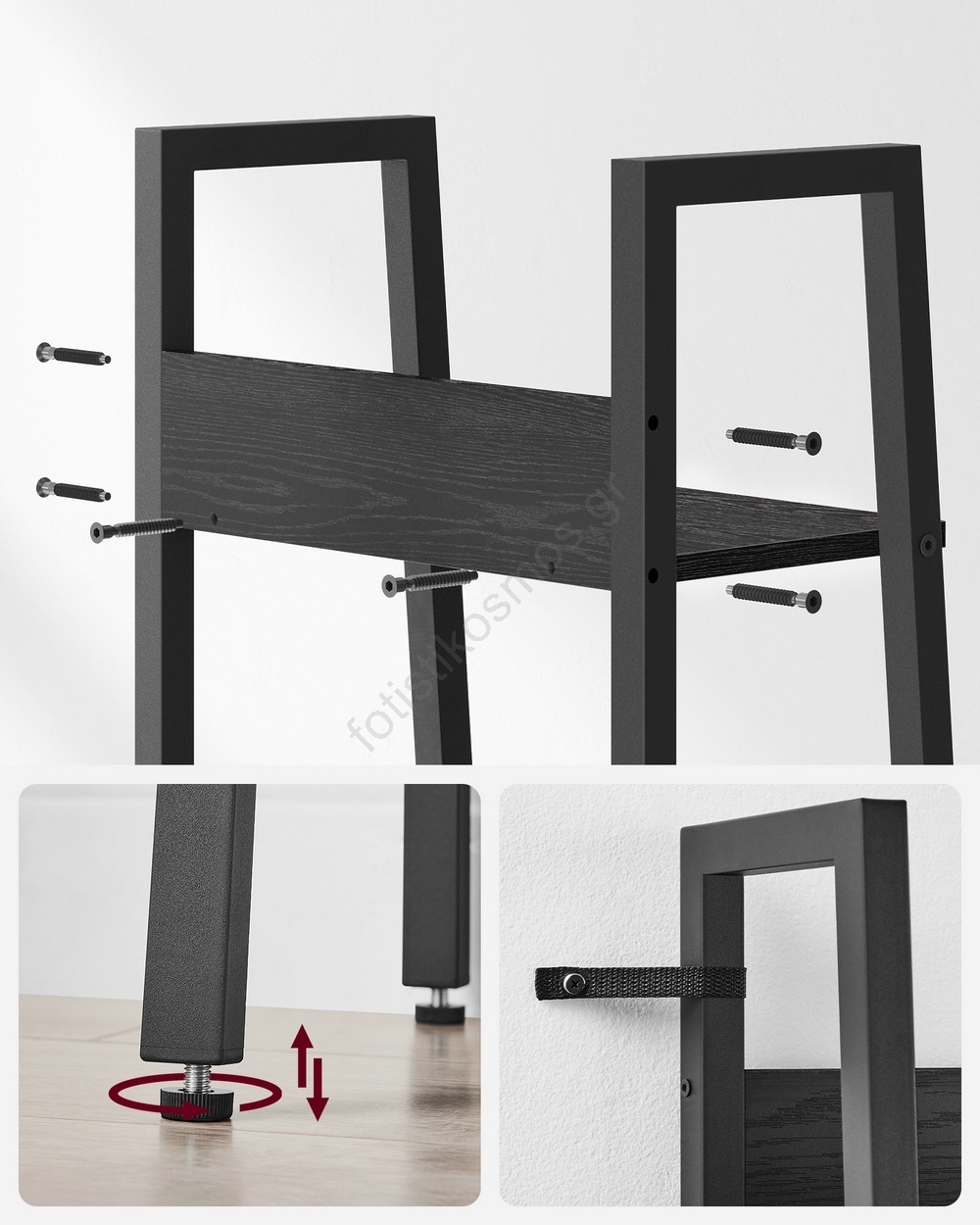 • Ρυθμιζόμενα πόδια και σετ κατά της ανατροπής εξασφαλίζουν ότι η βιβλιοθήκη σας θα παραμείνει σταθερή και δεν θα ταλαντεύεται.