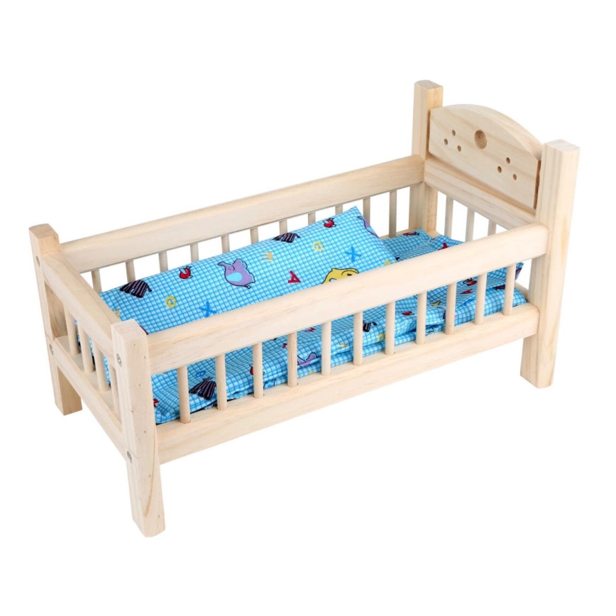 • Όμορφο κρεβατάκι από φυσικό, μη βαμμένο ξύλο, συμπεριλαμβανομένων των κλινοσκεπασμάτων.