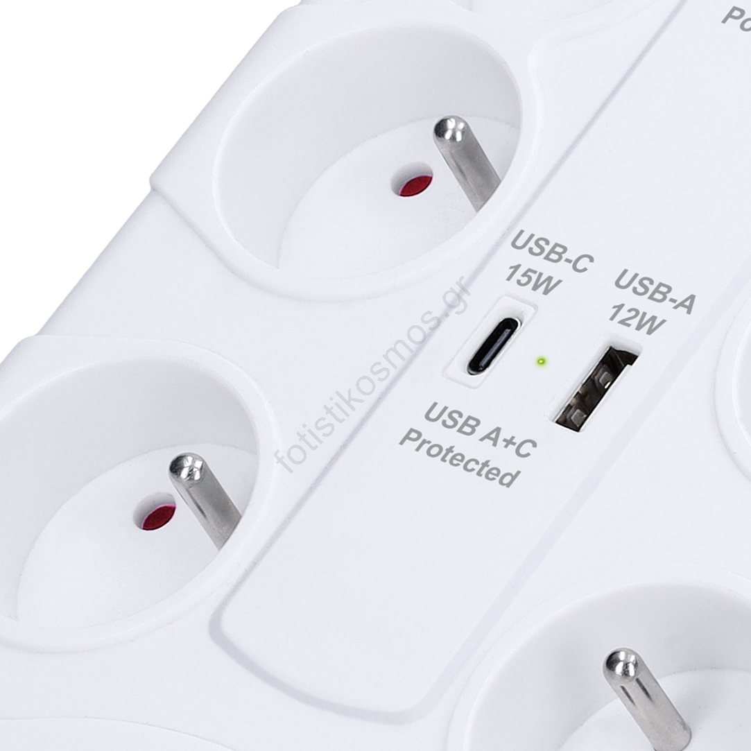 • Ενδείξεις LED: Προστασία από υπερτάσεις ενεργή, πρίζες 230V προστατευμένες, θύρες USB A + C προστατευμένες.