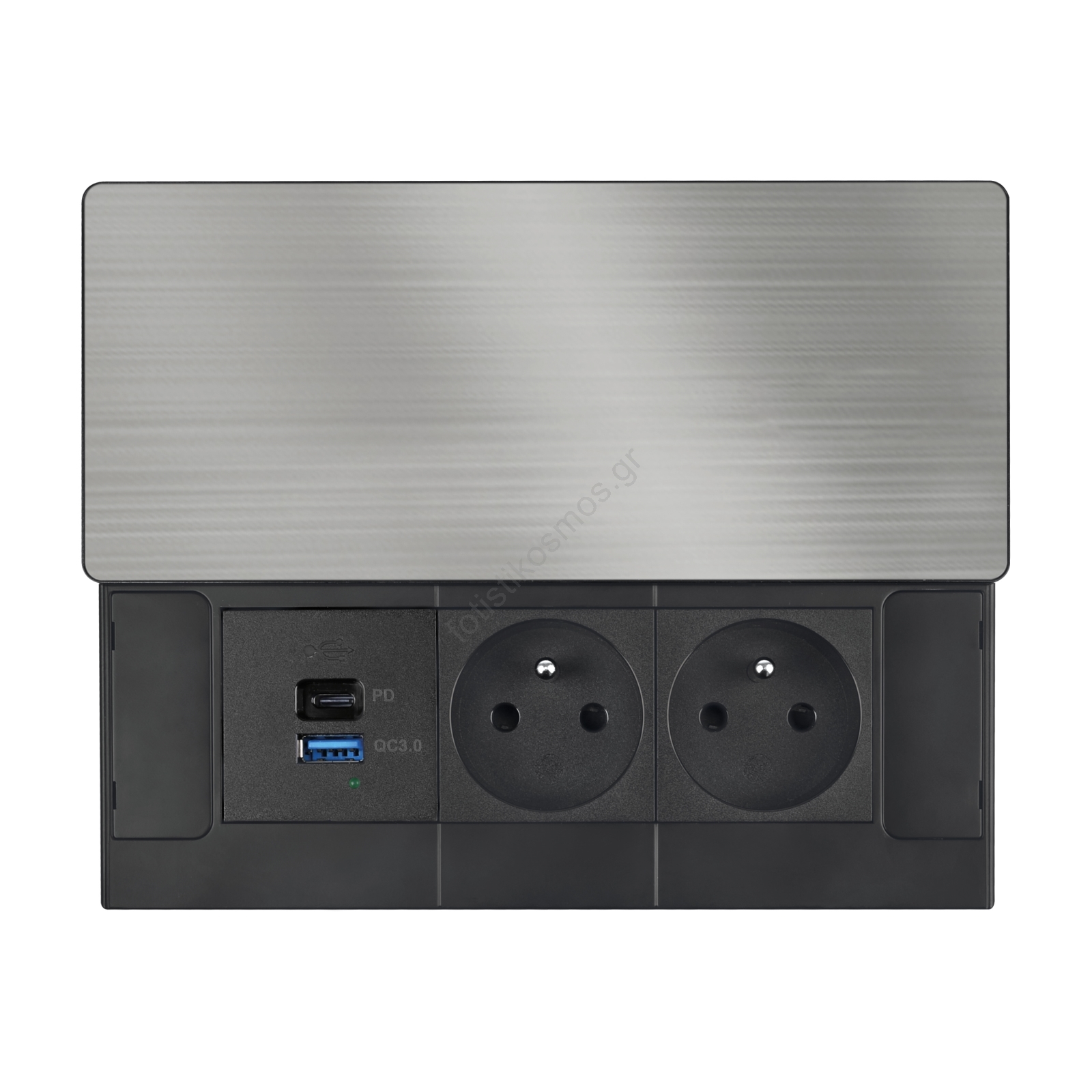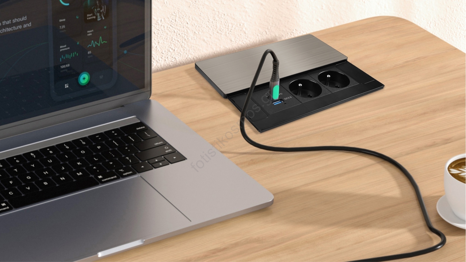 • Εντοιχιζόμενο μπλοκ πριζών με συρόμενο κάλυμμα, σχεδιασμένο για ενσωμάτωση σε πάγκο εργασίας ή έπιπλο ώστε να παραμένει επίπεδο όταν δεν χρησιμοποιείται.