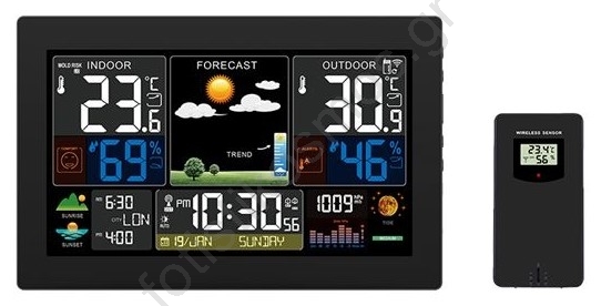 • Μετεωρολογικός σταθμός με μεγάλη έγχρωμη οθόνη LCD με οπίσθιο φωτισμό.