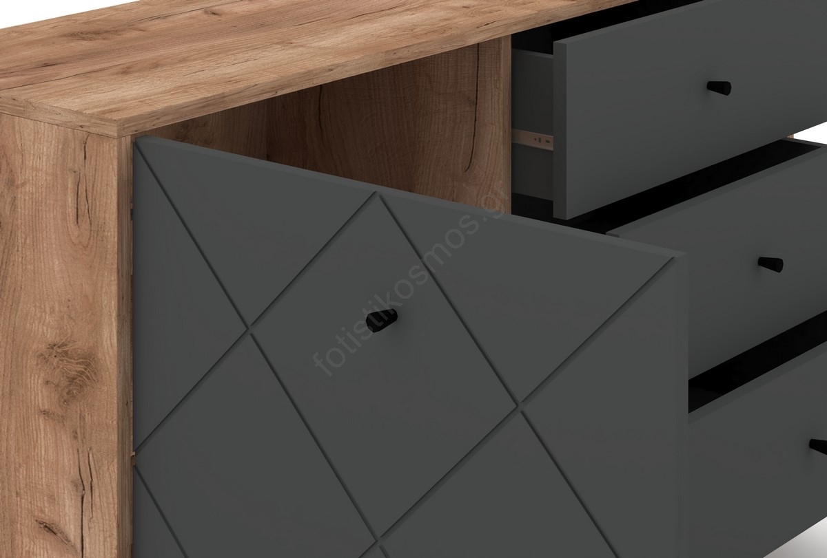 • Διαθέτει μία πόρτα στην αριστερή πλευρά και τρία συρτάρια στη δεξιά, για οργανωμένη αποθήκευση των αντικειμένων.
