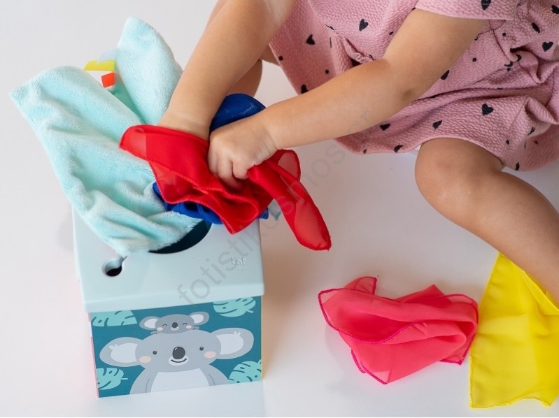 • Το παιδί μπορεί να βγάλει τα μαντηλάκια από το κουτί και να τα ξαναβάλει μέσα, να εξερευνήσει τις υφές τους και σε μεγαλύτερη ηλικία να αναγνωρίσει τα χρώματά τους και να τα μετρήσει.