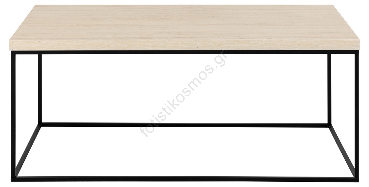• Επιφάνεια από τραβερτίνη με τραχιά μελαμίνη, βάση από ματ μαύρο ατσάλι με αδρή πούδρας βαφή.