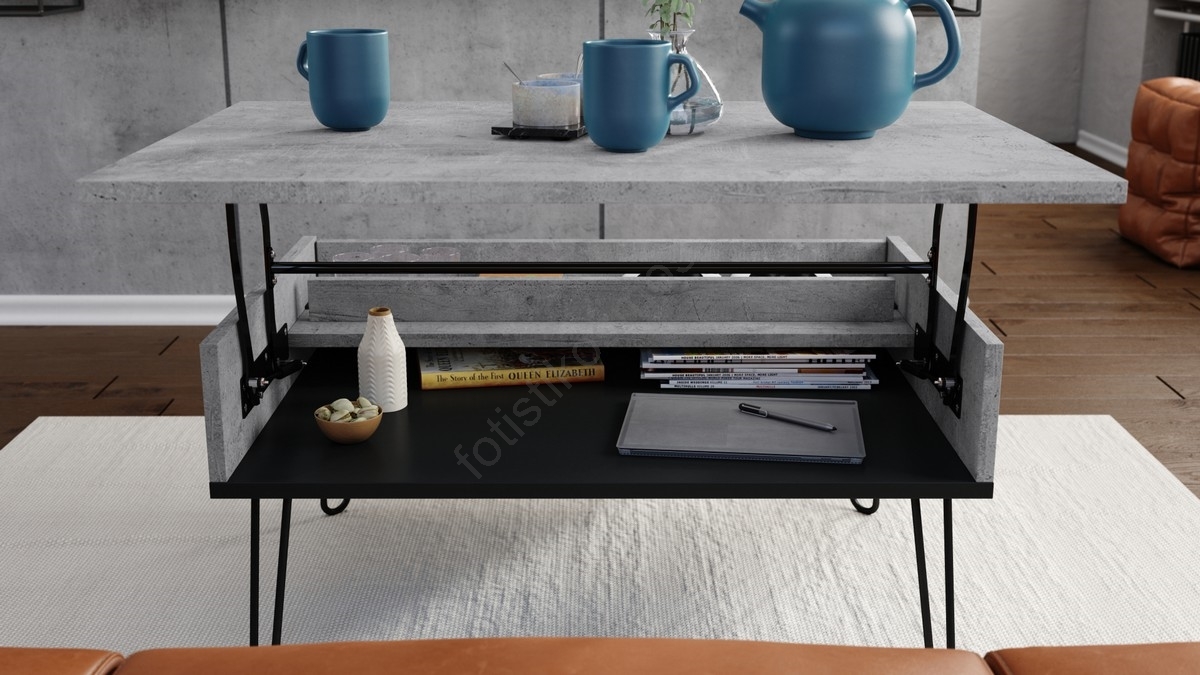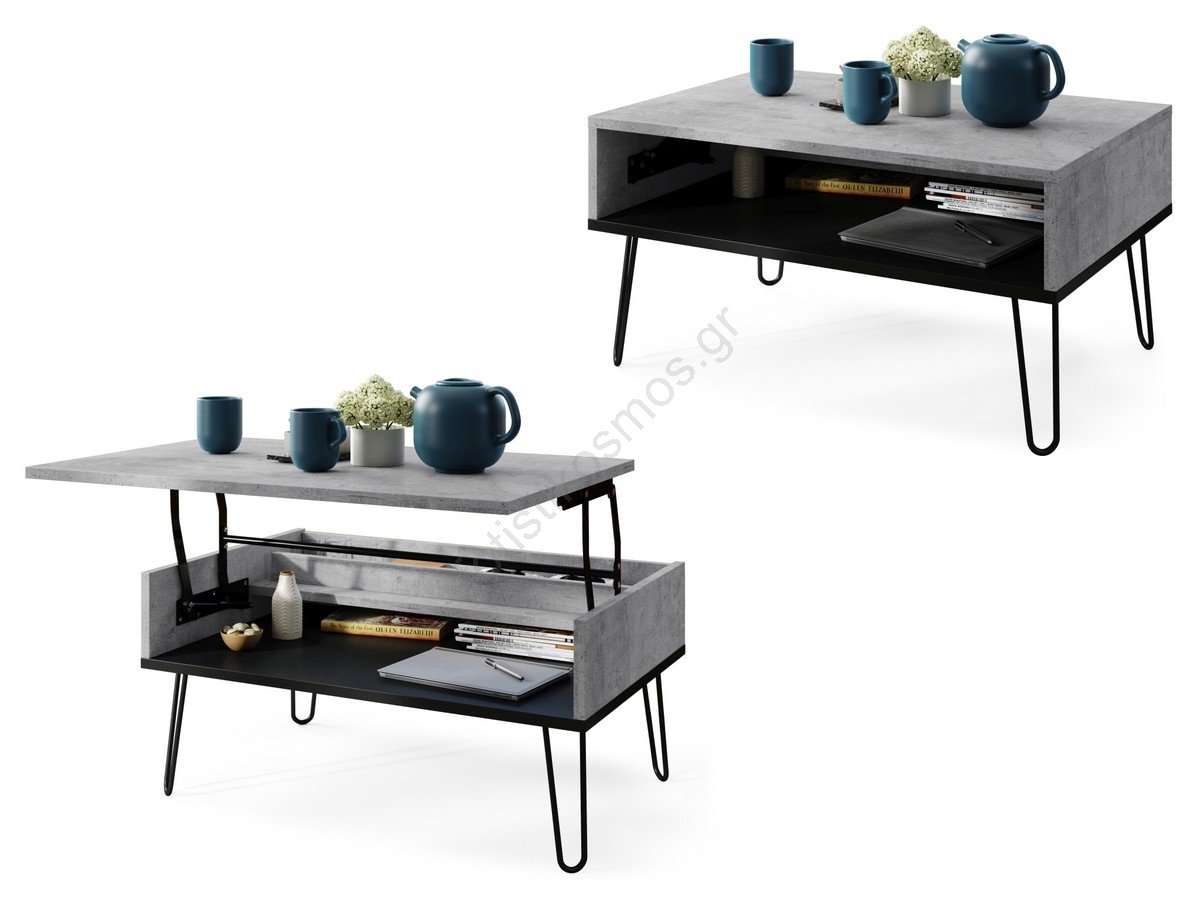 Τραπέζι σαλονιού με ανυψούμενη επιφάνεια και ράφι HALIJA γκρι σκυρόδεμα/μαύρο