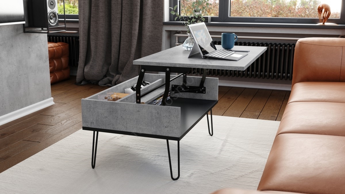 Τραπέζι σαλονιού HALIJA με ανασηκούμενη επιφάνεια και ράφι, γκρι μπετόν/μαύρο