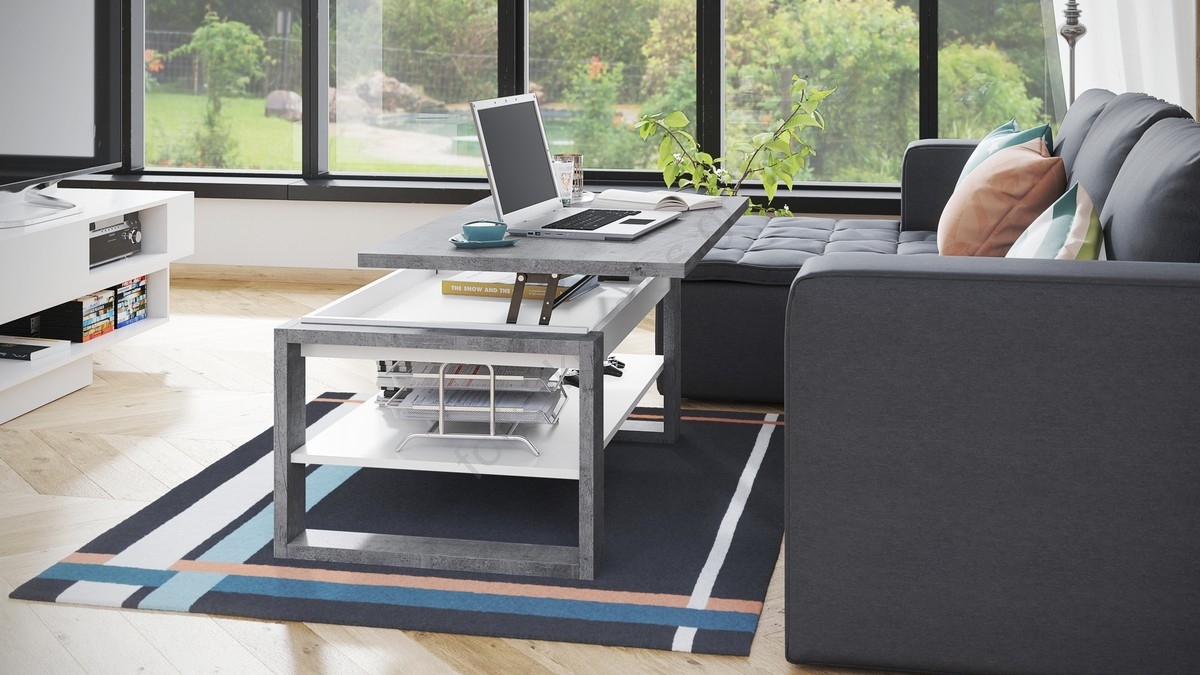• Τραπέζι σαλονιού NEA με ανασηκούμενη επιφάνεια και ράφι, γκρι μπετόν/λευκό
