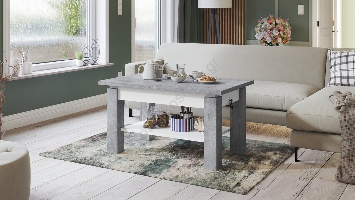 Αναδιπλούμενο τραπεζάκι σαλονιού/τραπεζαρίας με ράφι ADONIS σε γκρι τσιμέντο/λευκό