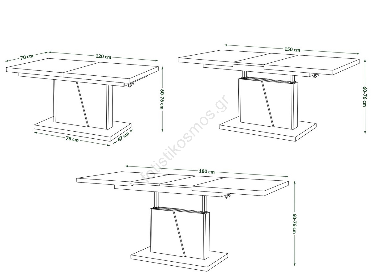 • Με δύο ένθετα 30 cm η επιφάνεια μπορεί να αυξηθεί σε 150 ή 180 cm.