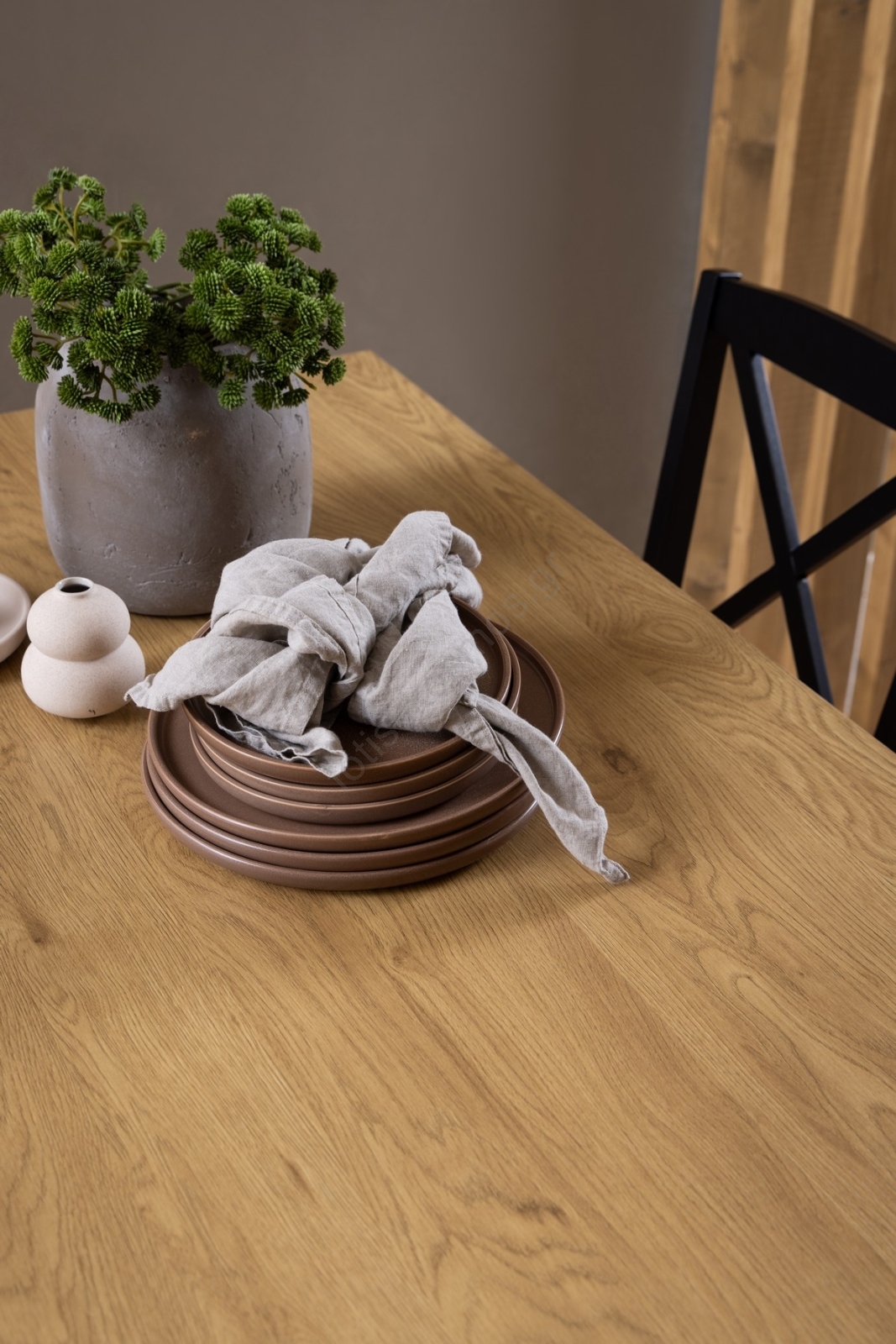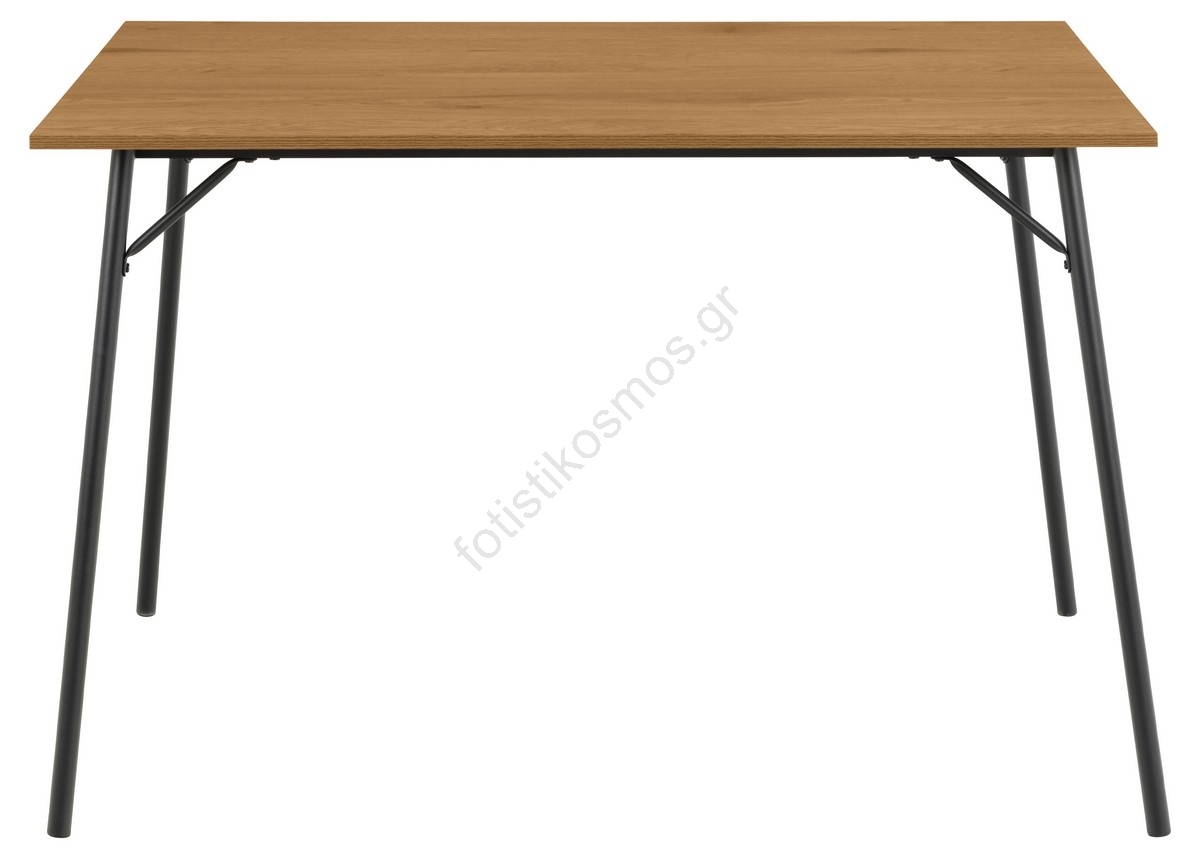 • Η ορθογώνια επιφάνεια τραπεζιού με όψη δρυός υποστηρίζεται από λεπτά μαύρα ατσάλινα πόδια.