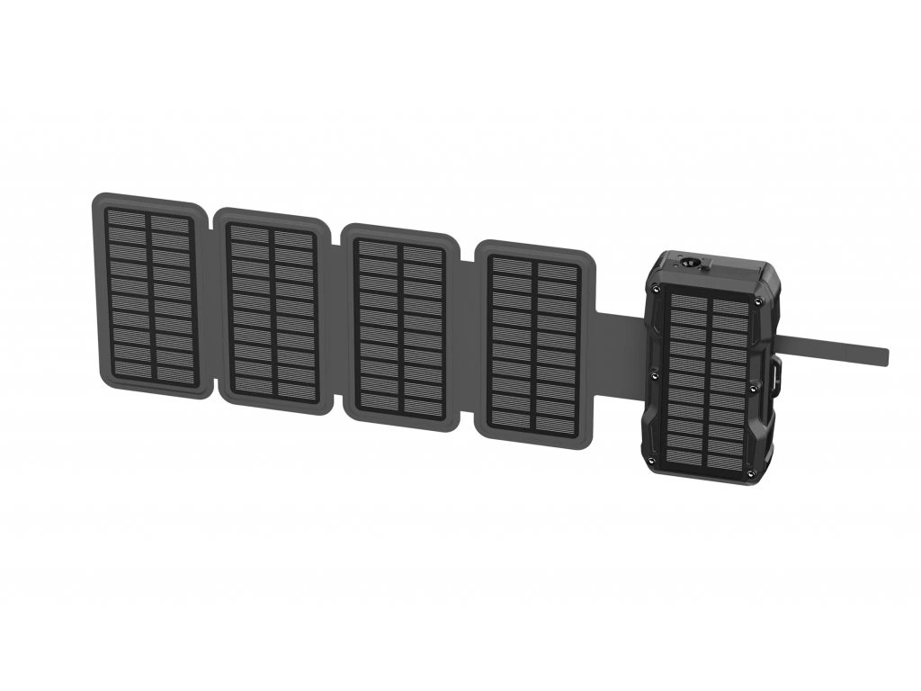 • Χάρη στον καινοτόμο αναδιπλούμενο ηλιακό πάνελ μπορείτε να φορτίζετε τις συσκευές σας από το ηλιακό φως, διασφαλίζοντας ότι το τηλέφωνο, το tablet ή τα άλλα ηλεκτρονικά σας θα είναι πάντα πλήρως φορτισμένα.