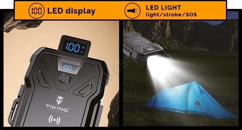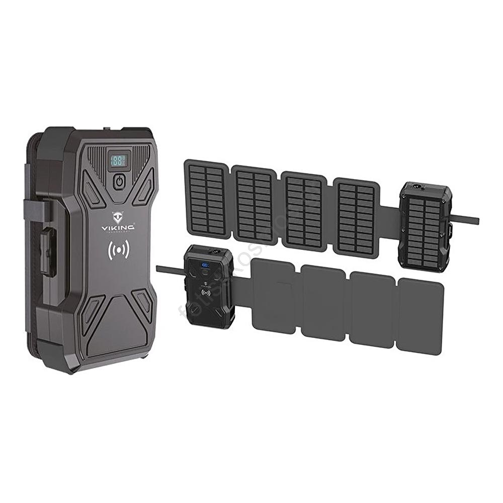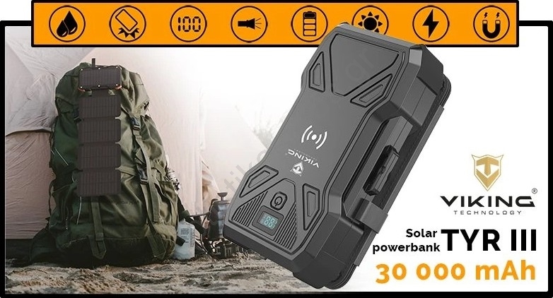 Viking - Powerbank με ενσωματωμένο LED φακό, ασύρματη φόρτιση και ηλιακό πάνελ Power Delivery 22,5W/30000 mAh