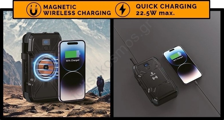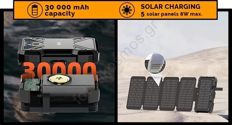 • Powerbank s χωρητικότητα 30000 mAh, με λειτουργία ηλιακής και ασύρματης φόρτισης και ενσωματωμένο LED φακό.