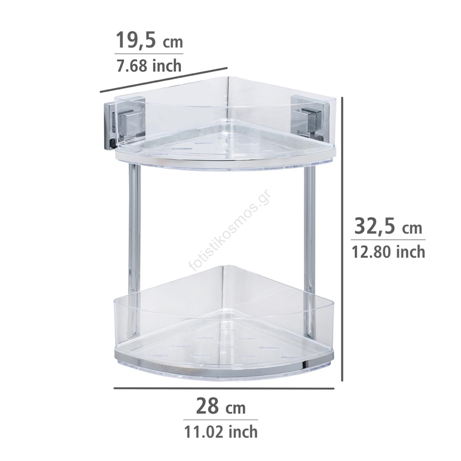 • Γωνιακό ράφι δύο επιπέδων – ιδανικό για οργανωμένη αποθήκευση ειδών μπάνιου.