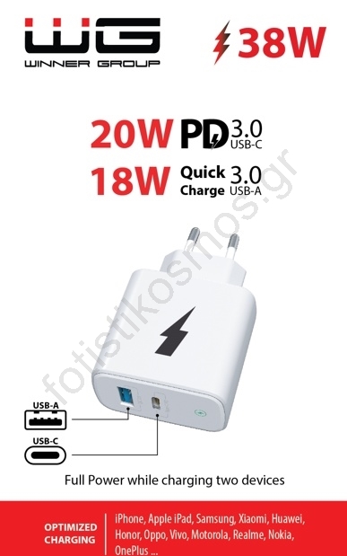 Winner Group - Αντάπτορας ταχείας φόρτισης 1xUSB-C + 1xUSB-A Power Delivery 38W λευκό | Fotisti kosm