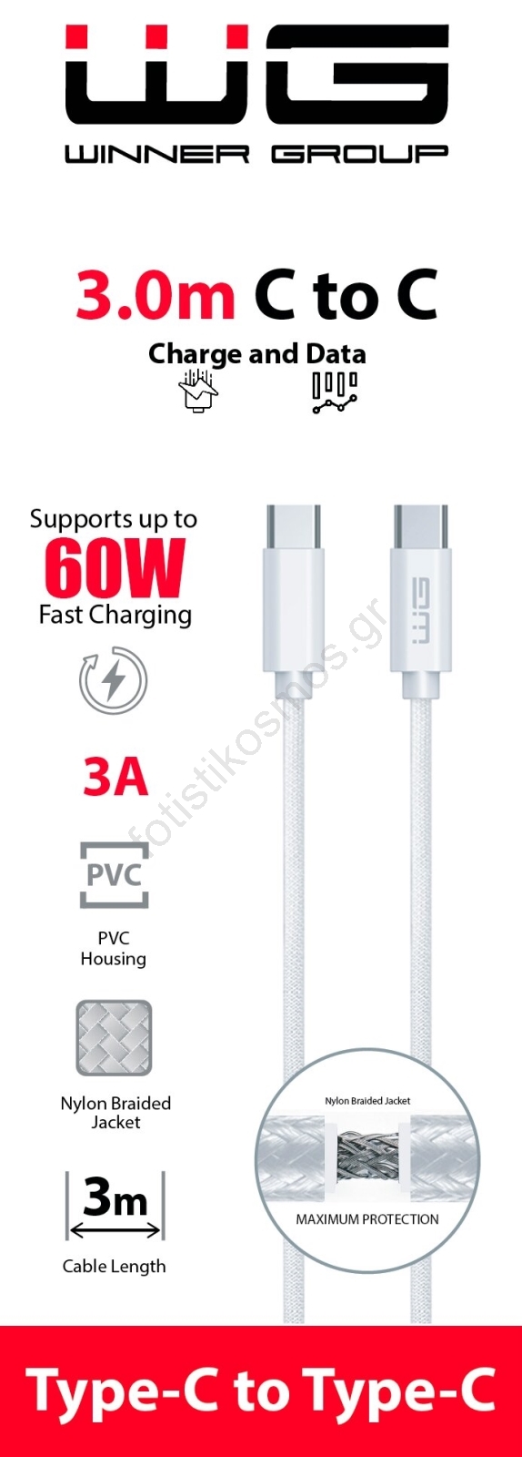 Winner Group - Καλώδιο USB USB-C / USB-C 60W 3m λευκό | Fotisti kosmos