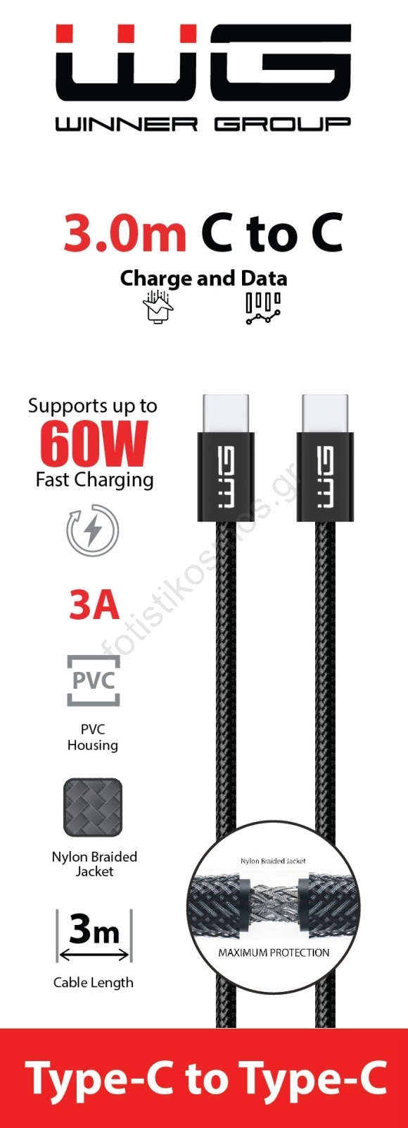 Winner Group - Καλώδιο USB USB-C / USB-C 60W 3m μαύρο | Fotisti kosmos