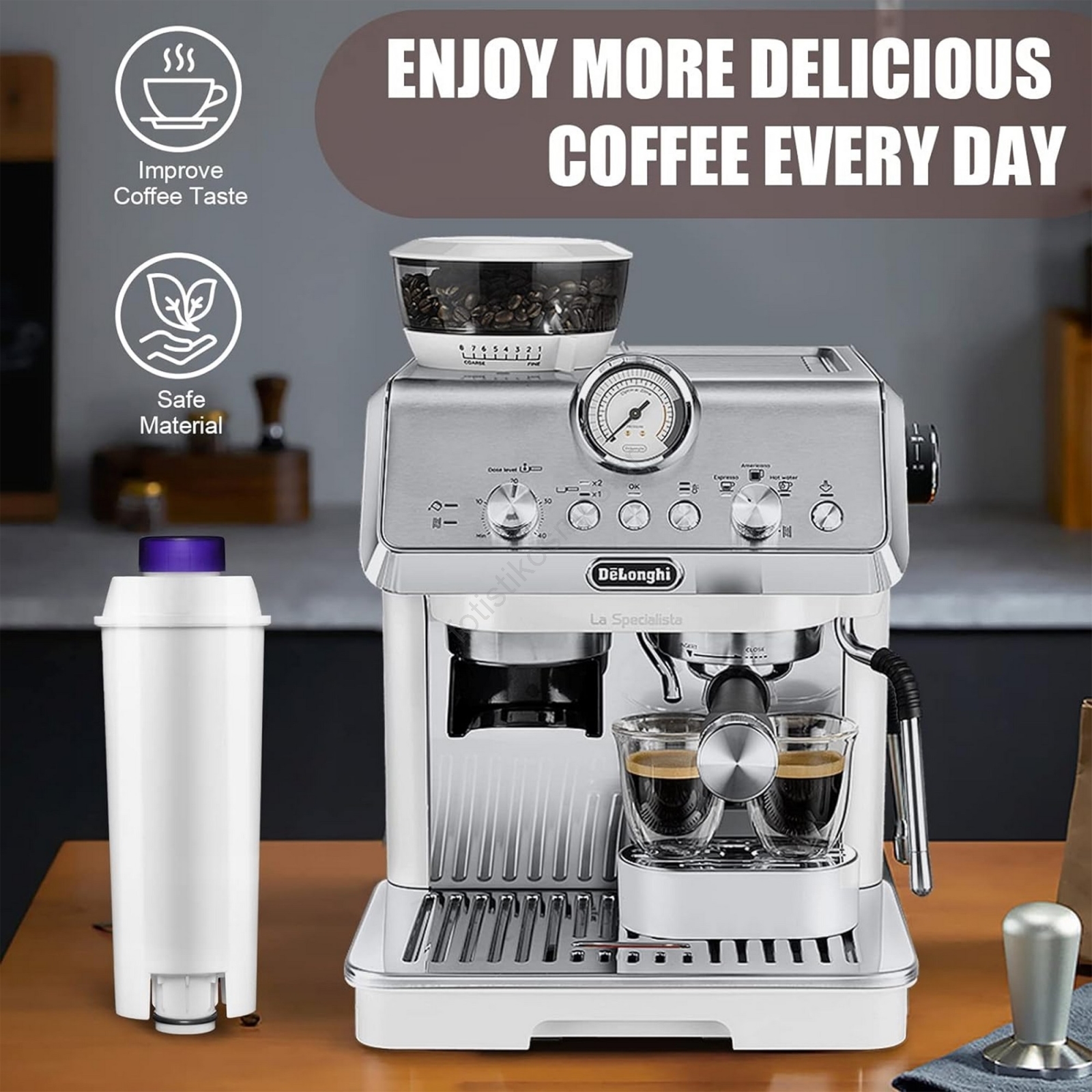 • Αυτό το υψηλής ποιότητας φίλτρο απομακρύνει αποτελεσματικά τις ακαθαρσίες και την εναπόθεση αλάτων, βελτιώνοντας την ποιότητα του νερού, κάτι που συμβάλλει σε μεγαλύτερη διάρκεια ζωής της μηχανής σας.