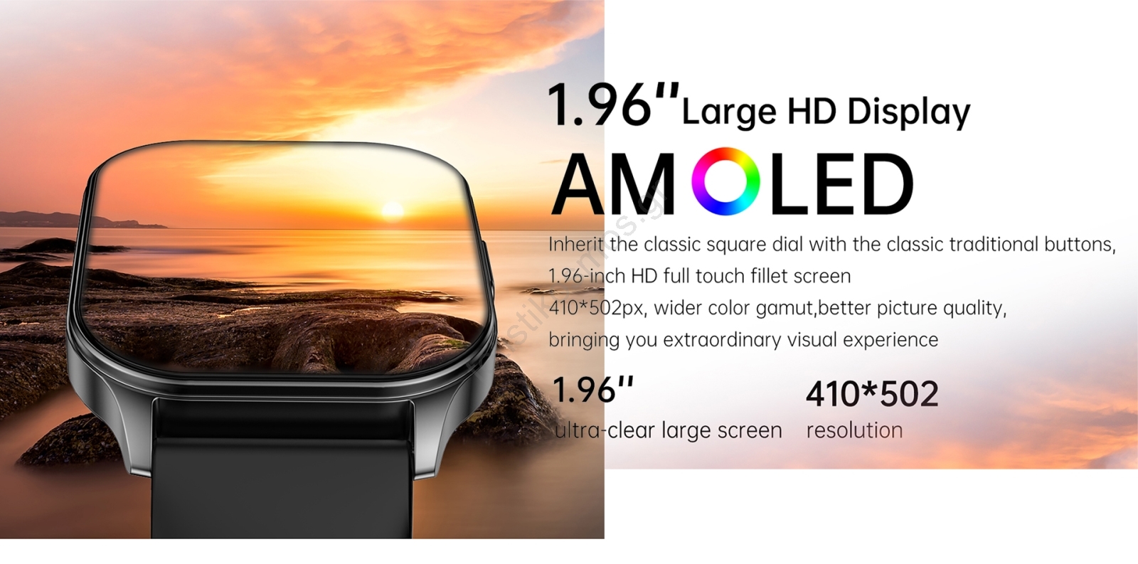 • Το ορθογώνιο καντράν με το κλασικό κουμπί του προσδίδει κομψή εμφάνιση και η 1,96 ιντσών οθόνη HD προσφέρει εξαιρετική ποιότητα εικόνας, χάρη στην οποία μπορείτε να διαβάζετε εύκολα και άνετα τις ειδοποιήσεις εφαρμογών ή τα γραπτά μηνύματα.
